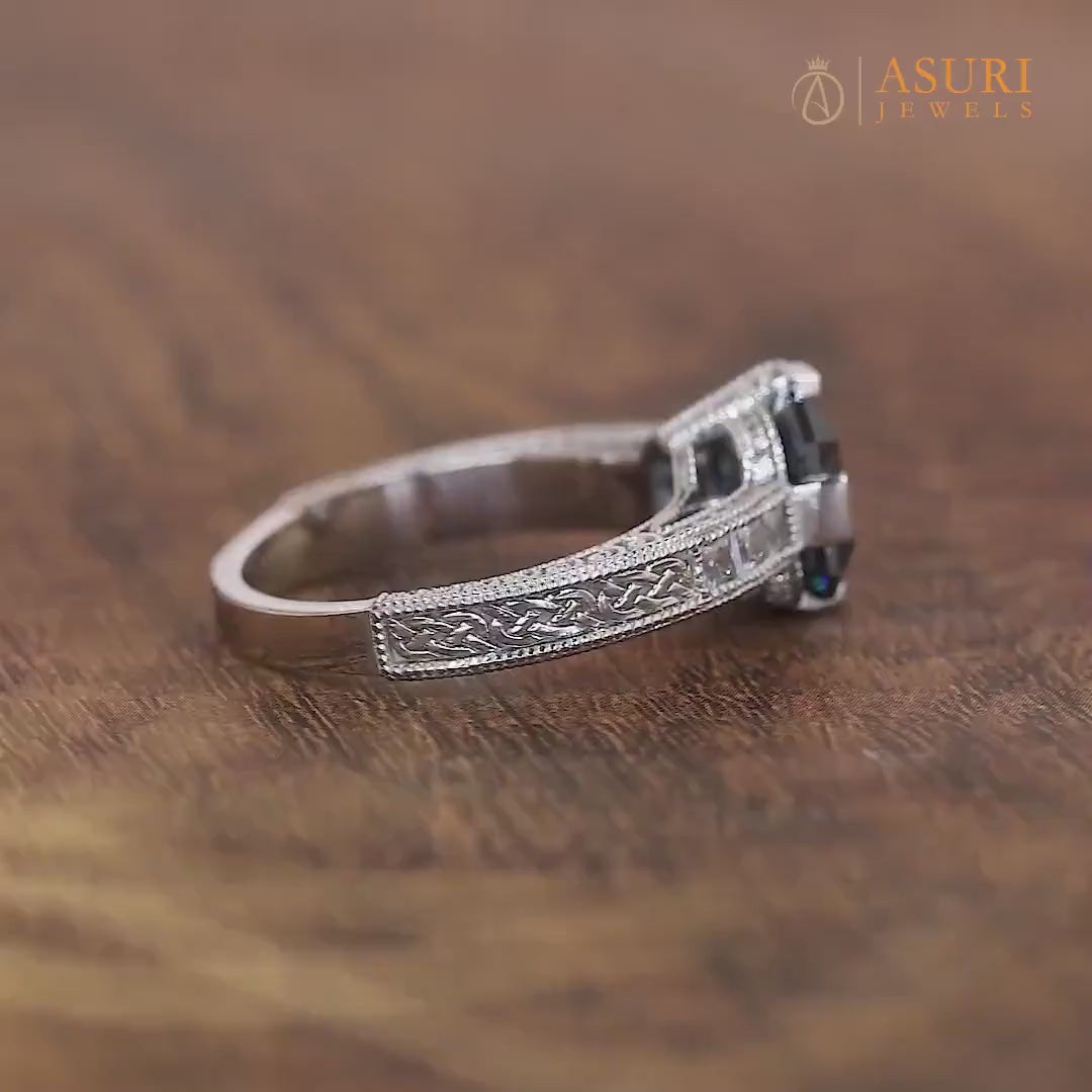 Electric Dark Blue Moissanite Asscher Cut Engagement Ring, Antique Vintage Carved Ring, Art Deco Filigree Rings For Women, Unique Ring, Engraved Vintage Ring, Blue Moissanite Ring