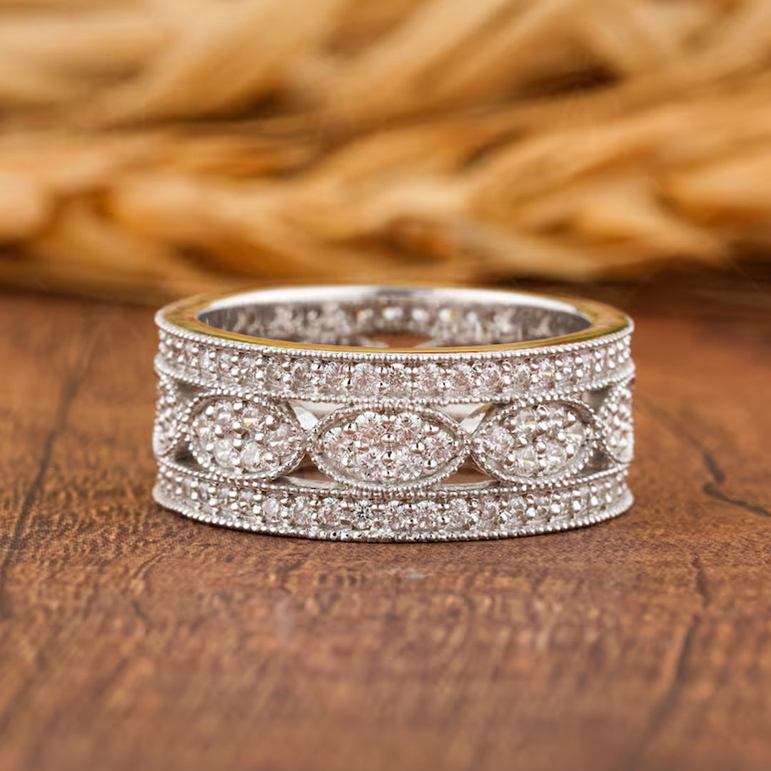 Asuri Jewels presents exquisite vintage-style moissanite eternity bands, designed with intricate detailing and a continuous row of shimmering stones that encircle the band in timeless brilliance. Each piece reflects heirloom elegance and refined craftsmanship.